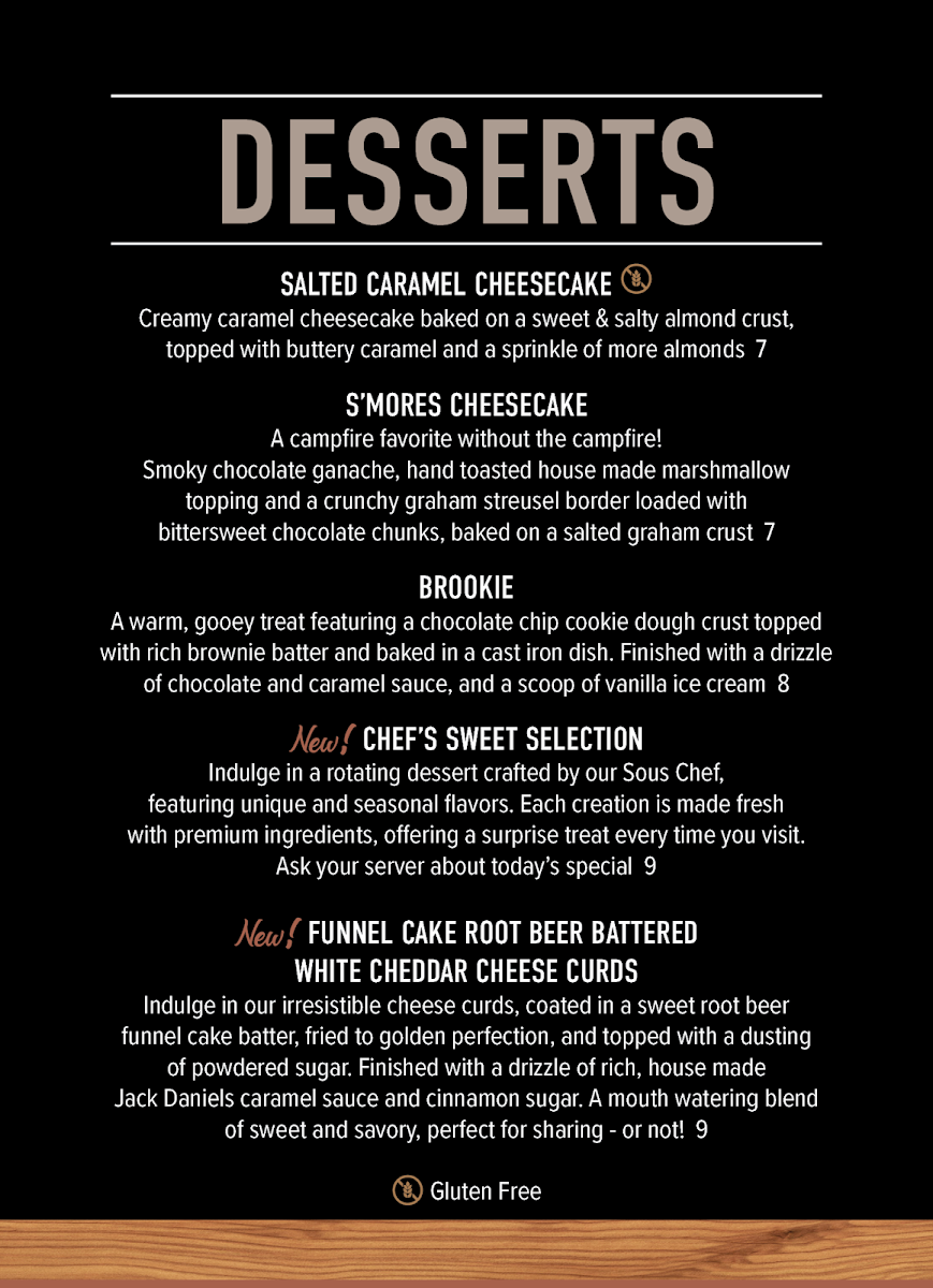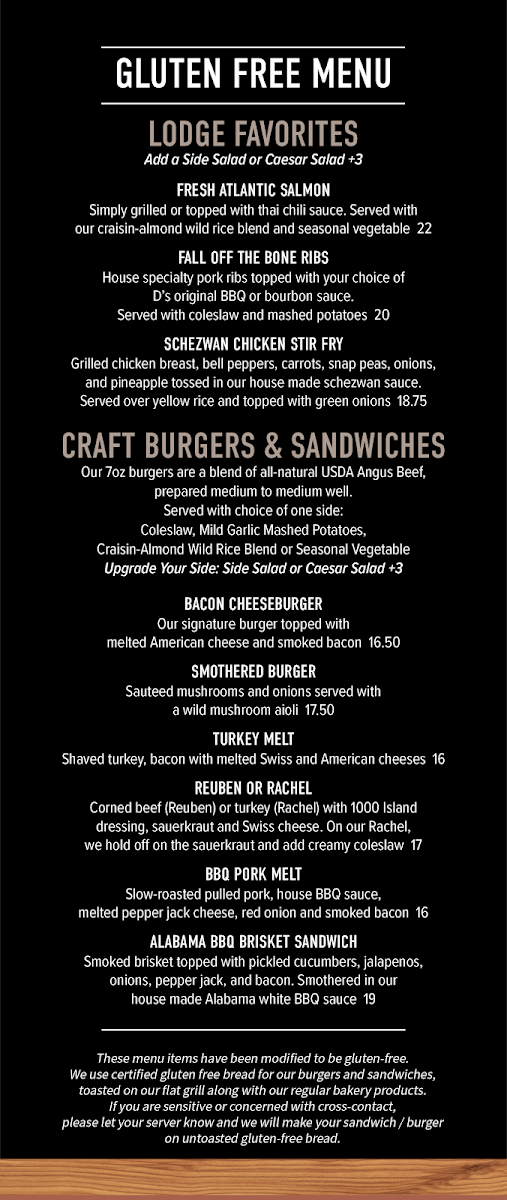 The menu features a variety of craft burgers, including the indulgent Bacon Gouda Mac & Cheese Burger, and the robust Big DMB with all the classic fixings. For those seeking gluten-free options, try the GF Bacon Cheeseburger or the savory GF Smothered Burger.